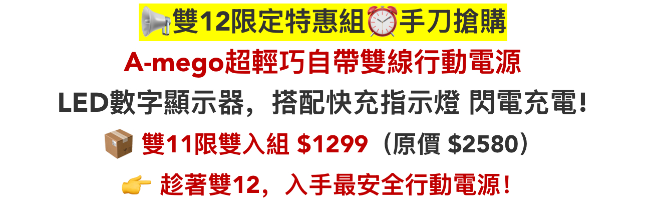 12分鐘前【🎁雙十二聖誕狂歡慶】A-mego AB100 MINI-2 超輕巧自帶雙線行動電源, 可支援3組設備充電,超輕巧187g,LED數字顯示器,適用各種裝置 蘋果筆電,手機平板,遊戲機,風扇,連接20W以上充電器可同時充放電 - 【🔥雙12限時開團】STARSKY 掌心美型自帶雙線快充行動電源✨加碼再送掛繩充電線 3入組僅需NT$1580